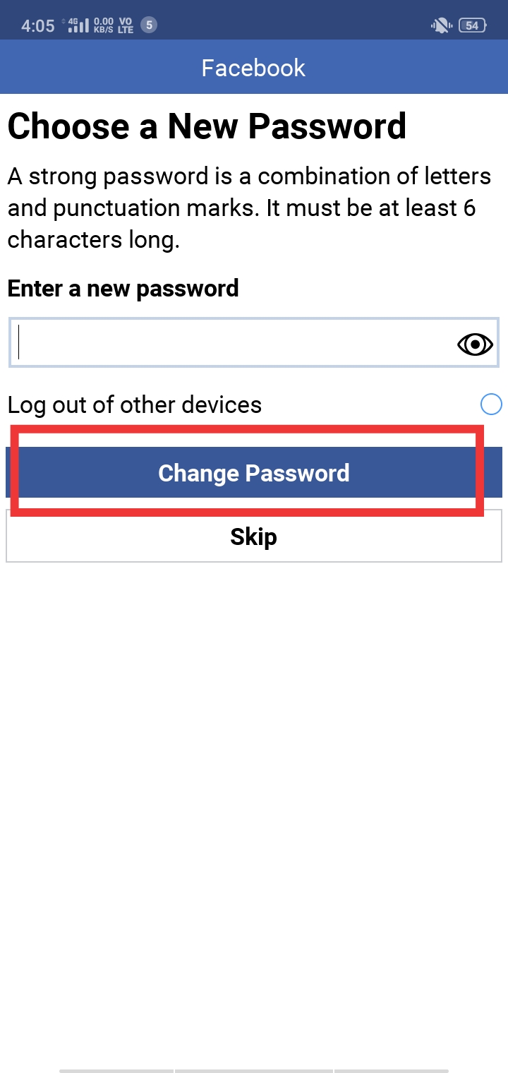 अब आपको enter a new password के नीचे दिए गए बॉक्स में अपना new password डालकर log out of other devices वाले चैकबॉक्स पर टिक करके नीचे दिए एक ऑप्शन change password पर click कर देना हैं। जैसे ही आप change password वाले ऑप्शन पर click करोगे तो आपके facebook account का homepage आपके सामने open होकर आ जाएगा।