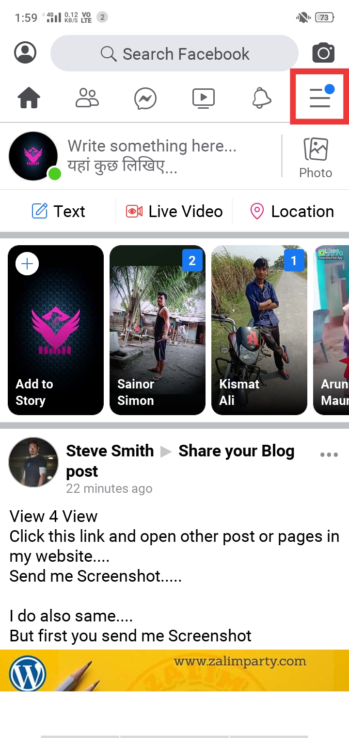 सबसे पहले हम अपने फेसबुक के ऐप को ओपन करेंगे जब हम फेसबुक ऐप को ओपन करेंगे तो नीचे दिए गए चित्र के बाद एक पेज ओपन होगा।