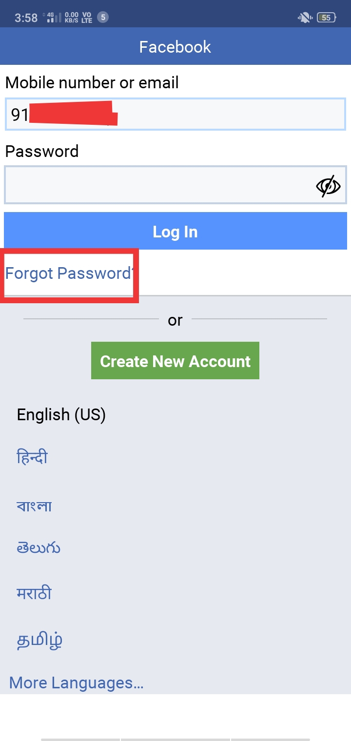 अब हम ऊपर दिए गए ऑप्शन mobile number or email में अपना mobile number या अपनी email को डालेंगे। इसमें हम केवल वही mobile नंबर डालेंगे जो हमने फेसबुक अकाउंट बनाते समय उस में डाला था अगर आपने मोबाइल नंबर से नहीं बल्कि ईमेल आईडी से अपना अकाउंट क्रिएट किया था तो आप उसी ईमेल आईडी को डाल देंगे.